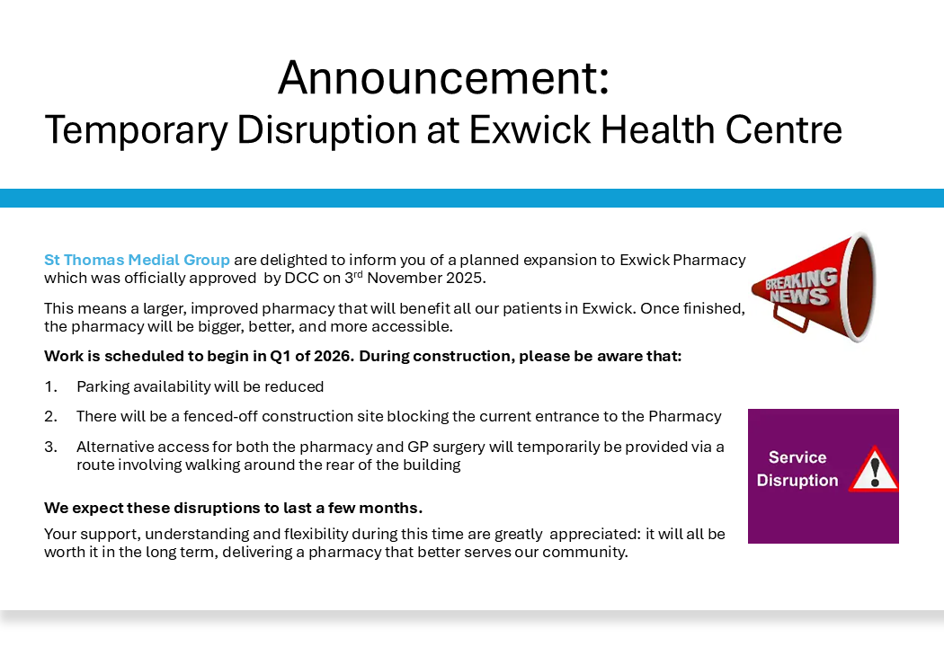 St Thomas Medial Group are delighted to inform you of a planned expansion to Exwick Pharmacy which was officially approved by DCC on 3rd November 2025.